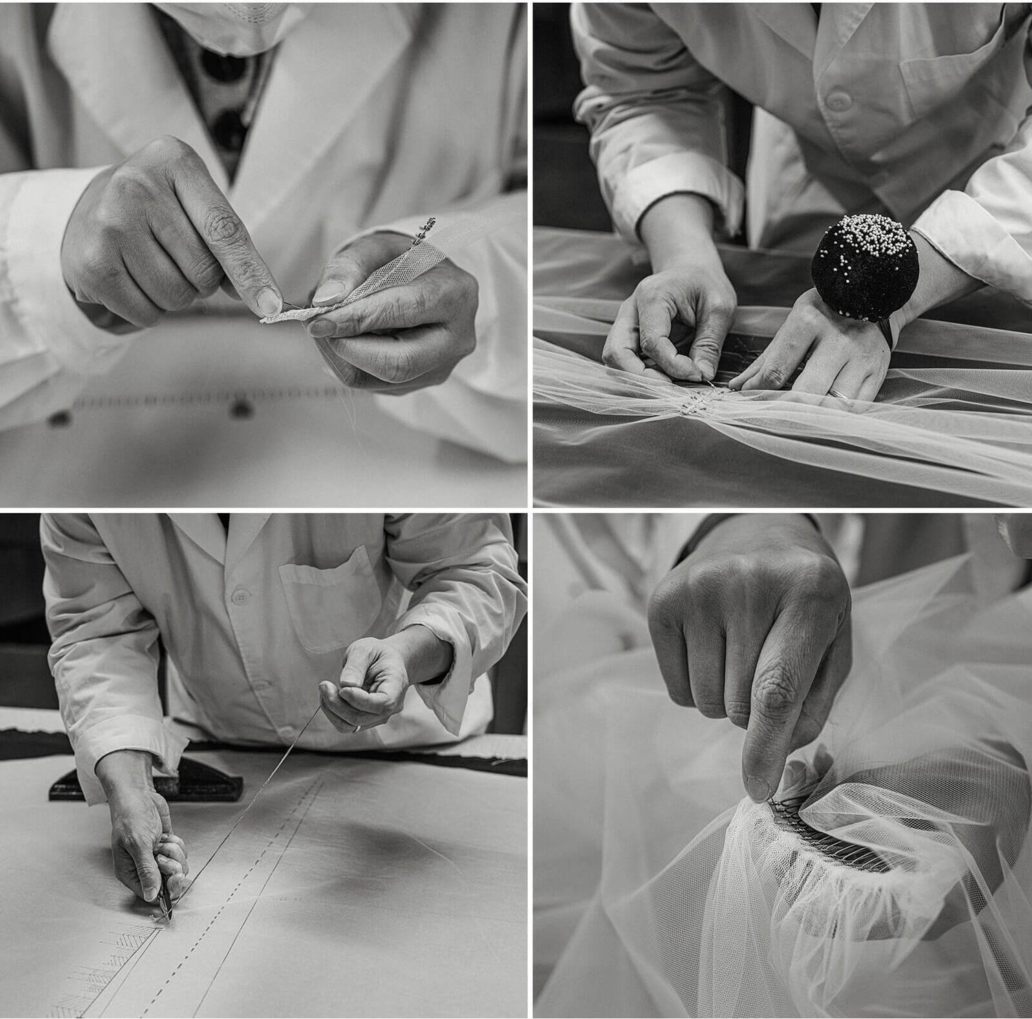 A truly exquisite veil requires precise pleating patterns for its construction. Each stitch must first secure the pleats before positioning and sewing, ensuring the delicate tulle is held in place with absolute precision.