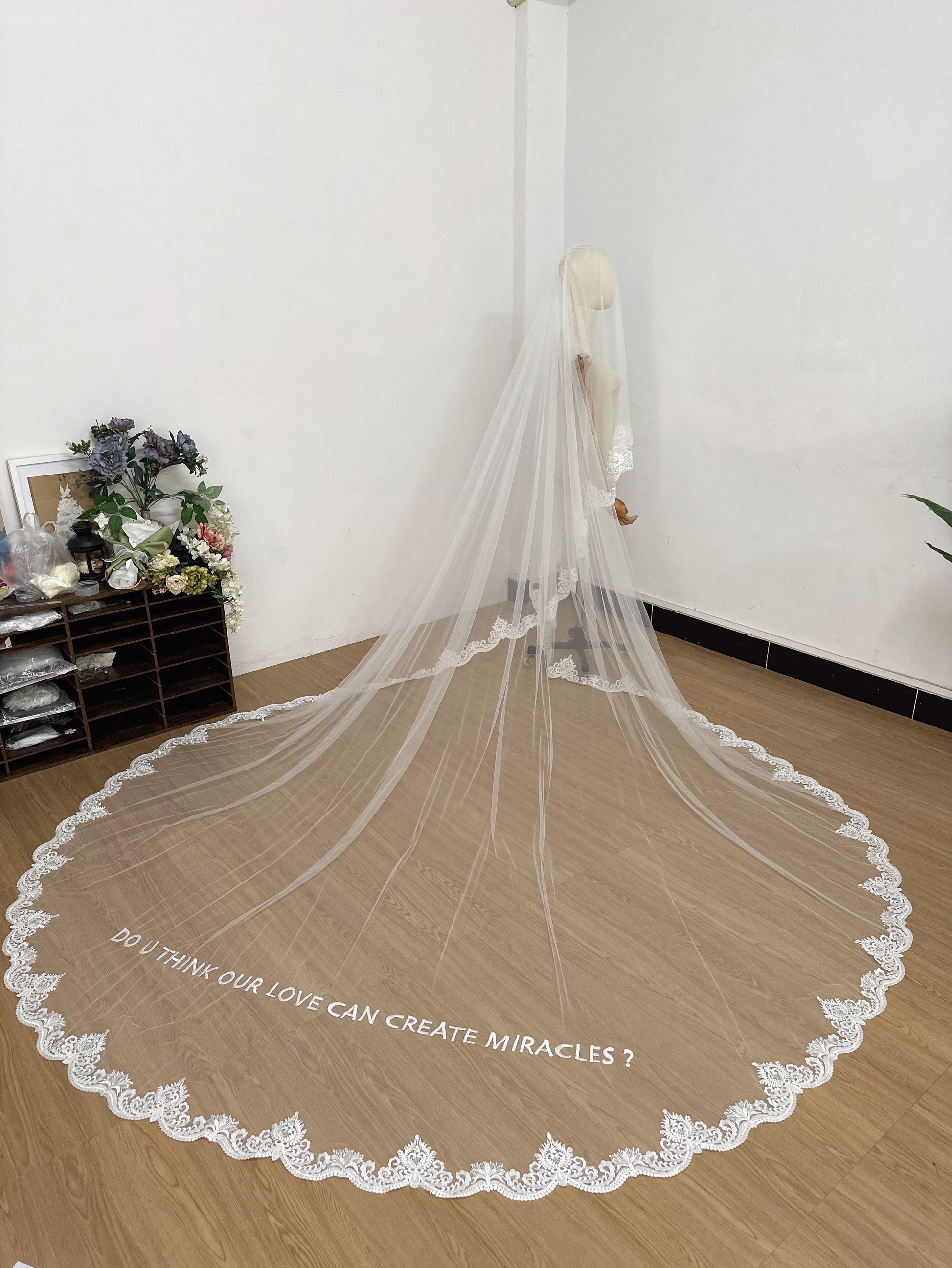 Exquisite Chapel Length Veil: The E021 veil offers a stunning chapel length, extending gracefully to create an elegant silhouette. This length is ideal for brides with a chapel length dress.