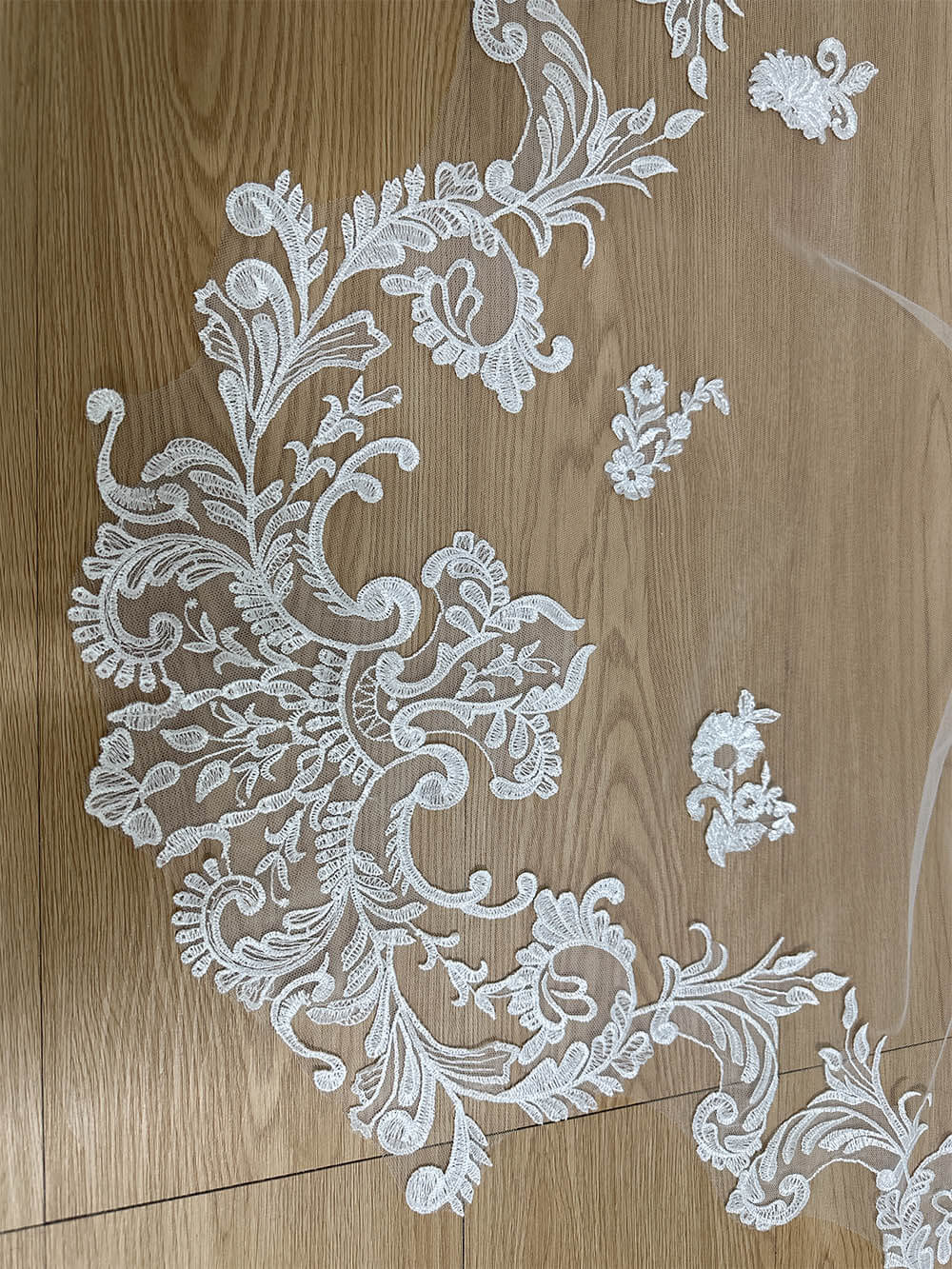 A: The veil features a wide-cut base designed to spread fully across a 3-meter length, ensuring it perfectly complements A-line and Ballgown wedding dresses.